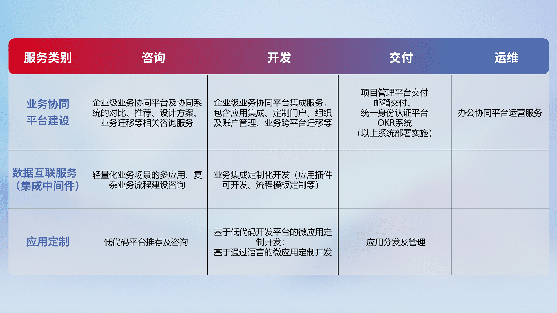 针对钉钉、、企微、、、IDaas等平台级产品提供产品的规划、、方案、、交付、、定制化开发等服务,,实现如统一协同办公、、智能客户服务、、、混合会议管理、、、智能数据查询、、、等业务场景,,,实现数字化转型。。。